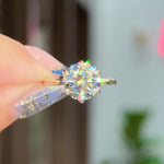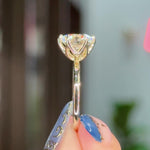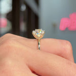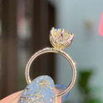 The Caraline, our signature petal prong engagement ring, is inspired by the delicate petals of a lotus flower. This exquisite ring features a unique petal prong setting, offered in a classic style with two elegant variations: a sleek, high-polish finish or a band adorned with sparkling pavé diamonds. Crafted for comfort, the Caraline boasts a rounded band to ensure a comfortable fit.