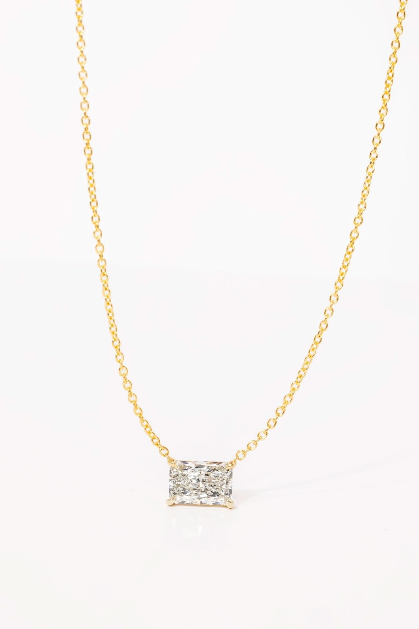 The Brandi Radiant Necklace is a refined, durable upgrade to our classic core solitaire style, designed to elevate your everyday look. This pendant features a lab-grown radiant-shaped diamond, set in our solid Brandi basket with a secure 4-prong design. It hangs from our upgraded thickness rolo chain, offering both strength and comfort for daily wear.