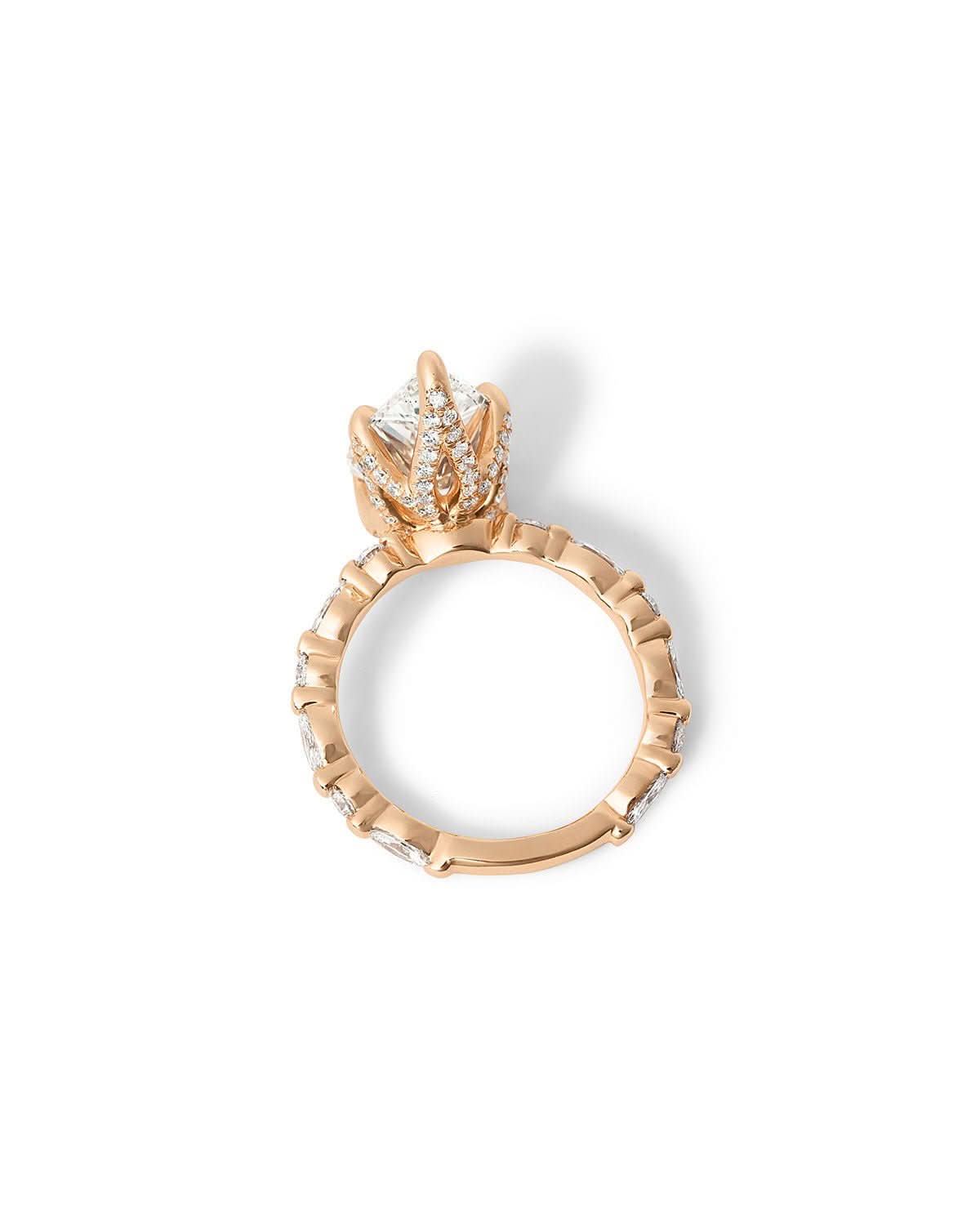 The Ren features a floating diamond band of marquise and round diamonds with pavé diamond lotus petal prongs.