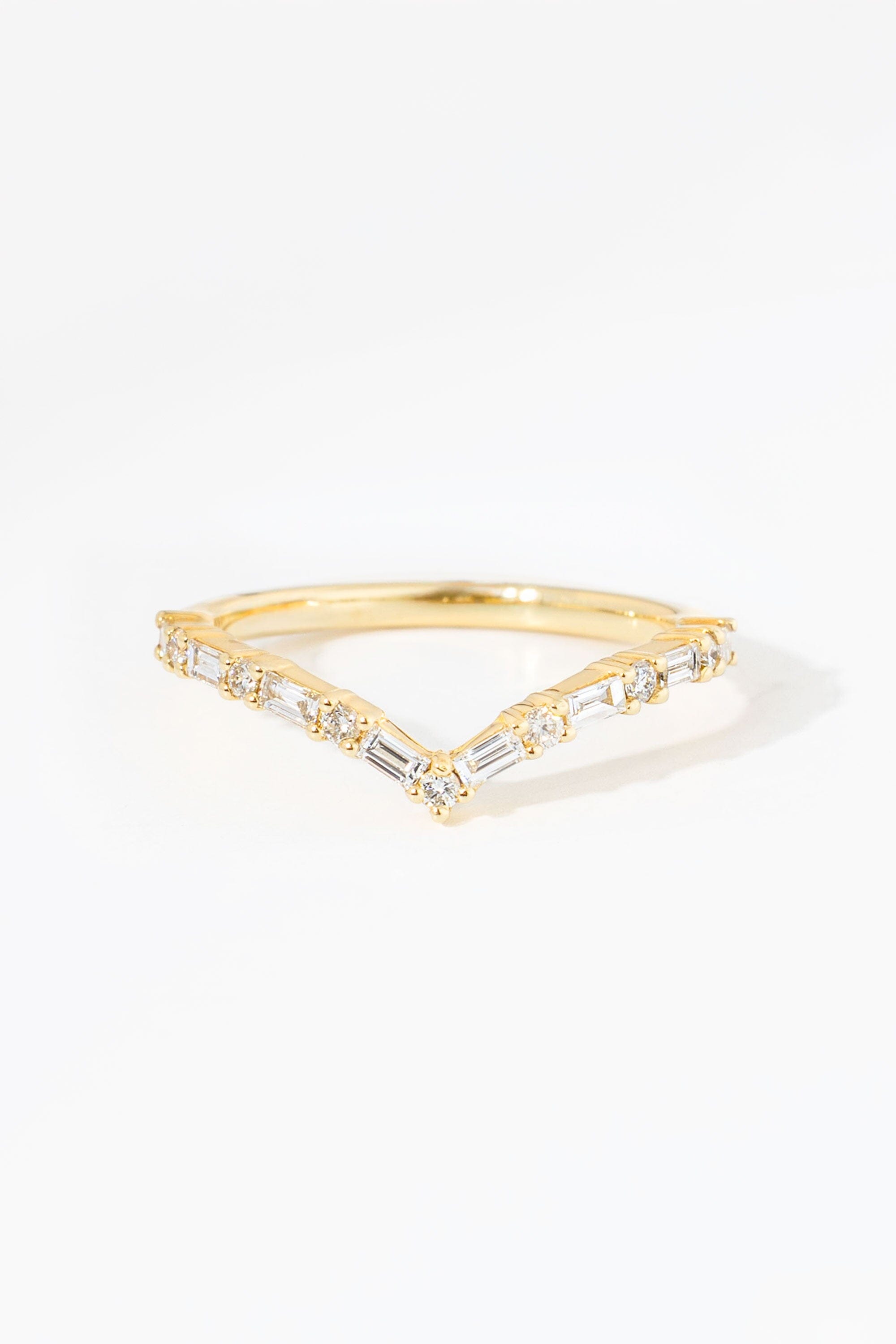 A graceful blend of modern design and classic sparkle. This chevron-shaped ring features a striking mix of 7 round diamonds (0.10cttw) and 8 baguette diamonds (0.25cttw), all set in polished 14K yellow gold. The pointed V-shaped silhouette makes it perfect as a statement ring, a contour band for stacking, or a stylish wedding band alternative.
