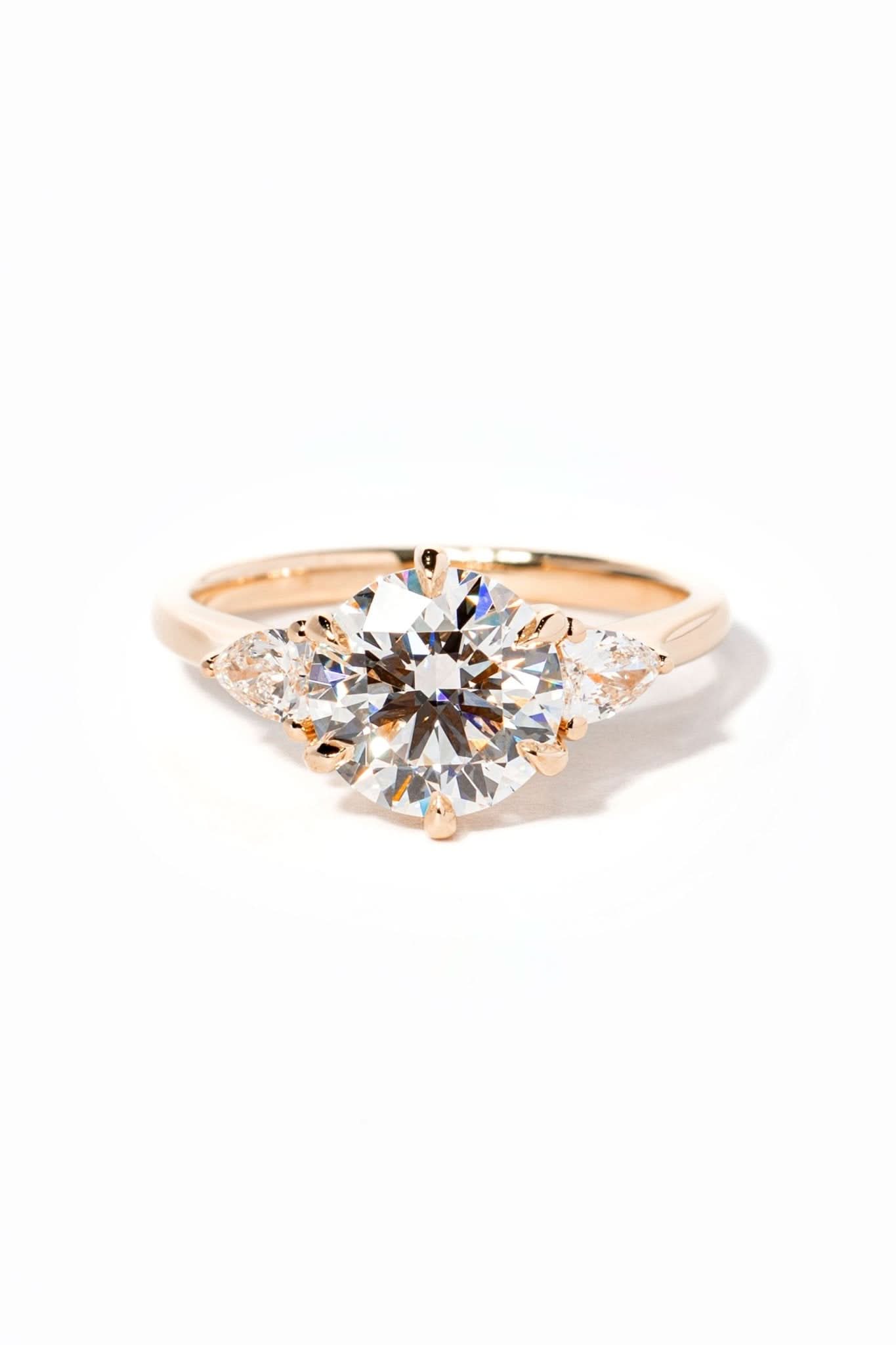 The Gracie features a high polish comfort fit band with two pear lab diamond side stones.
