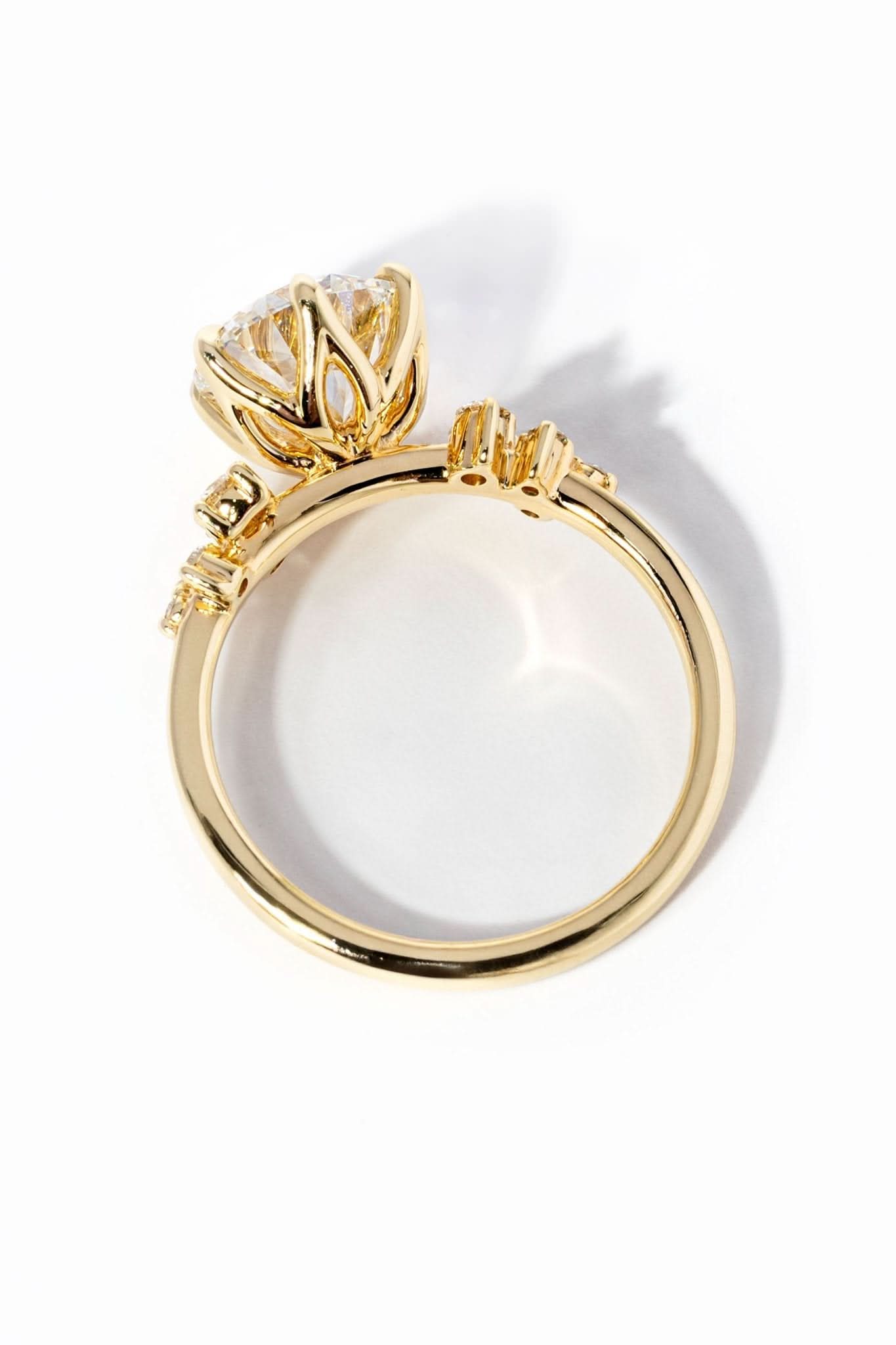 Introducing the stunning 1.6mm Nova Round flower petal prong engagement ring, the perfect symbol of love and commitment. This gorgeous ring features a sparkling round-cut diamond center stone, surrounded by delicate flower petal prongs. The 1.6mm band is crafted from high-quality, durable metal, making it perfect for everyday wear. The unique design of the petals adds a touch of elegance and femininity to the ring, making it the ideal choice for any bride-to-be. With a timeless and classic design, this engagement ring will be treasured for a lifetime. Shop now and make your proposal unforgettable.