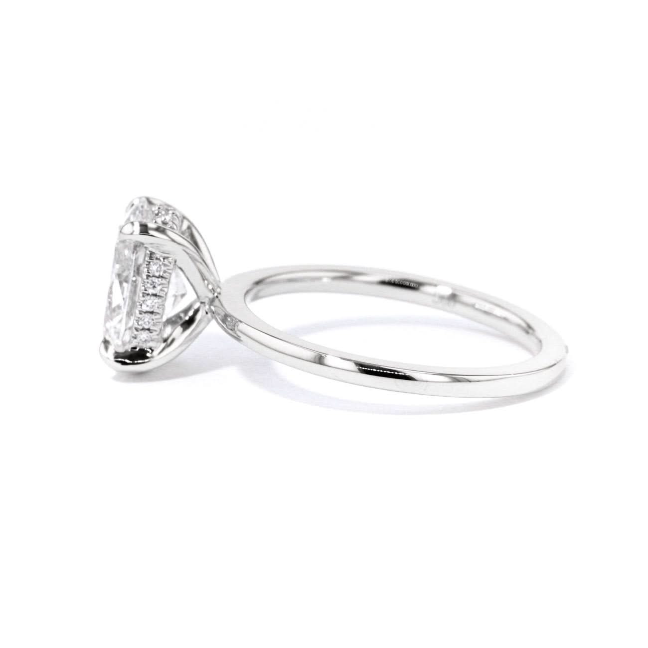✦ Hidden Halo: A band with diamonds set into it that goes underneath the center stone and sits between the prongs. This style works best for rounded diamond shapes. It can only be seen from the side, not the top, and is slightly more recessed under the stone.