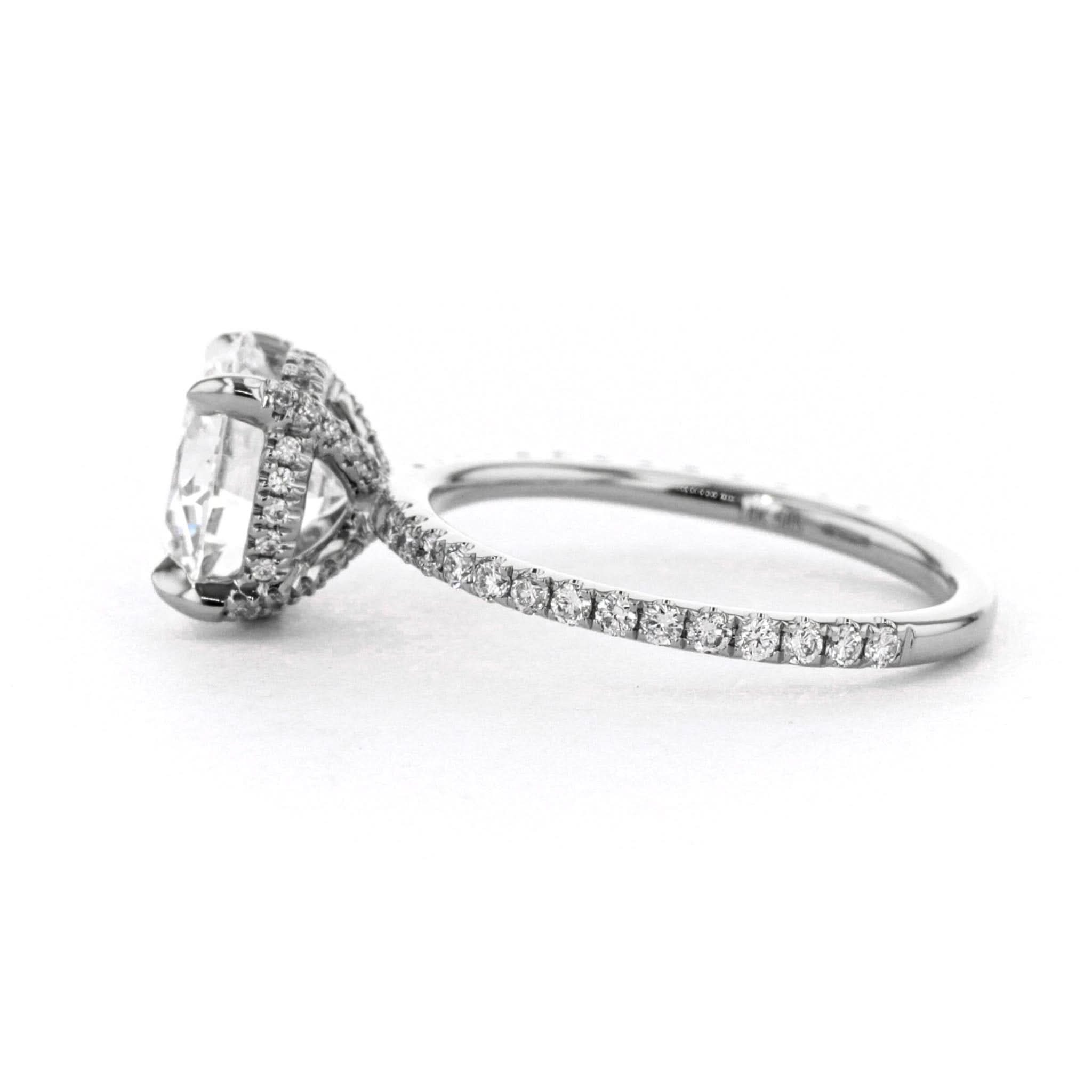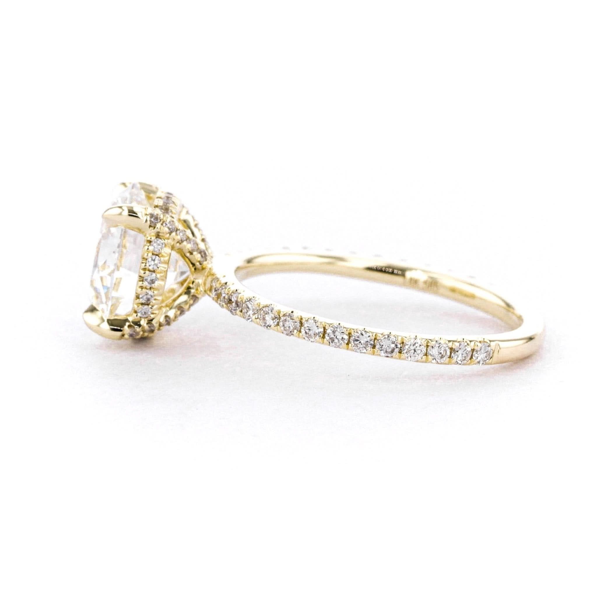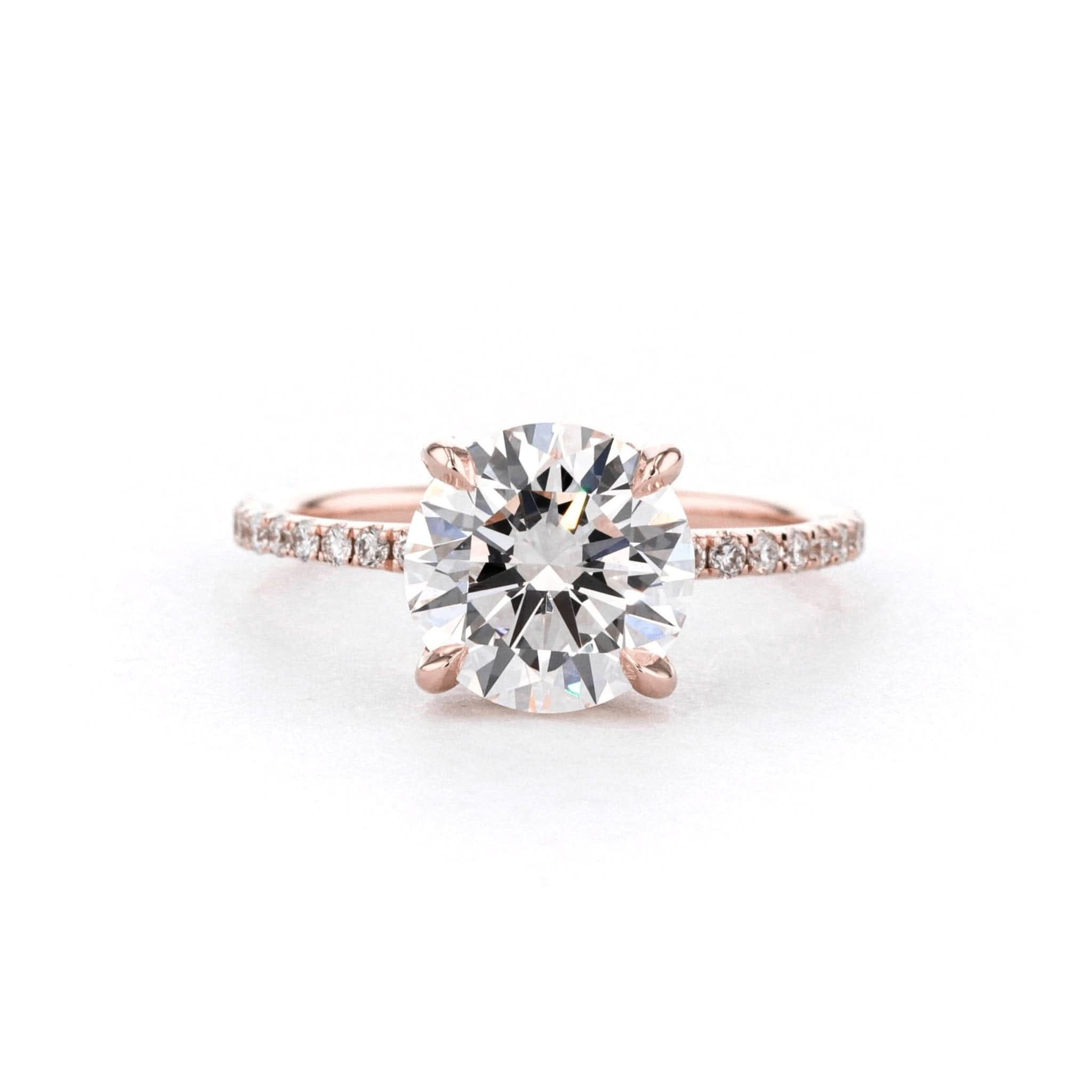 The Shelby features a classic pavé band with a hidden inner under halo and pavé diamond prongs.