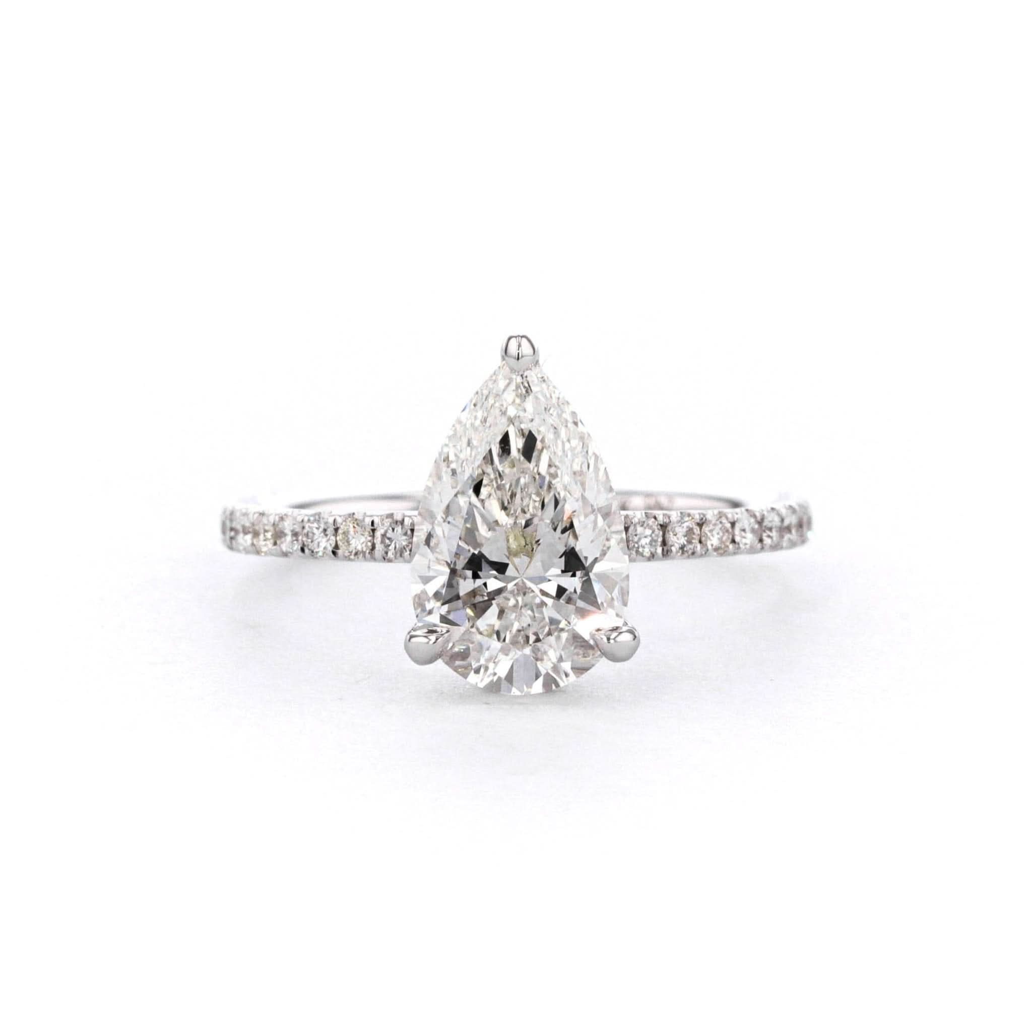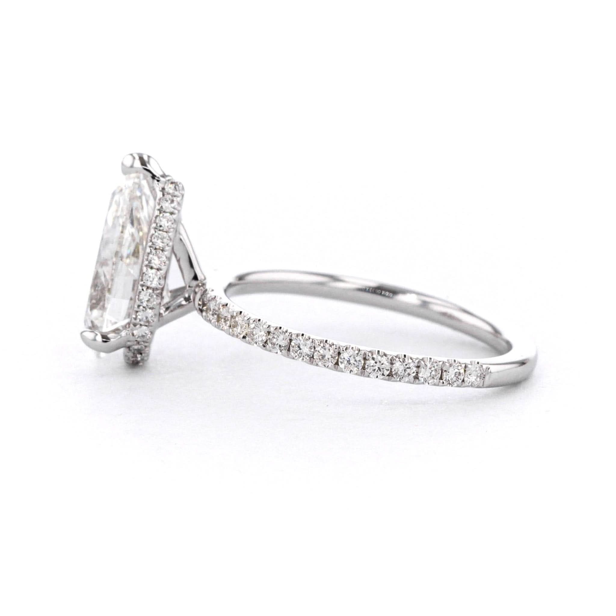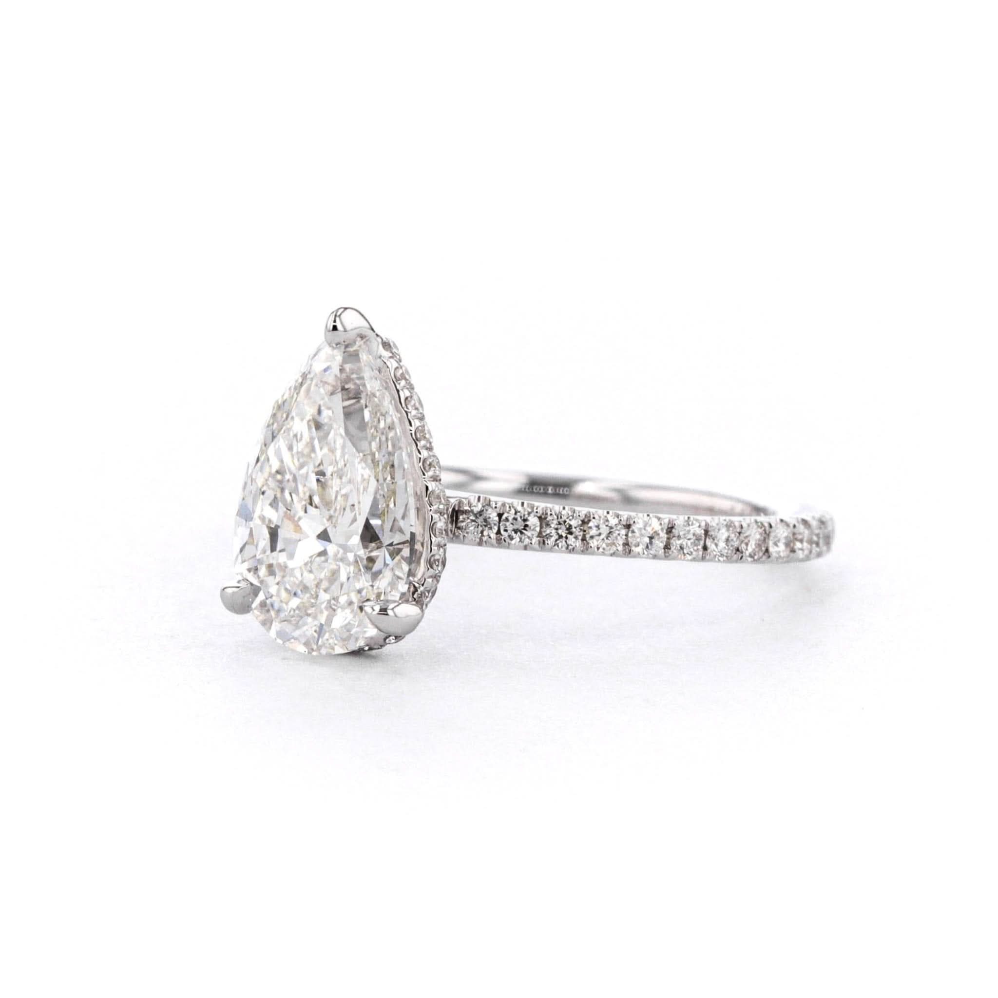 ✦ Under Halo: A band with diamonds set into it that goes underneath the center stone and wraps around the outside of the prongs. This wrap-style pavé under halo more distinctly matches the shape of the center stone and lends itself best to square or unique diamond shapes, such as heart shapes. This under halo is easier to see than a hidden halo but can only be seen from the side, not the top.