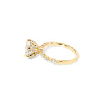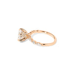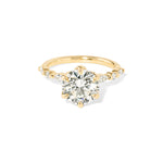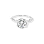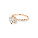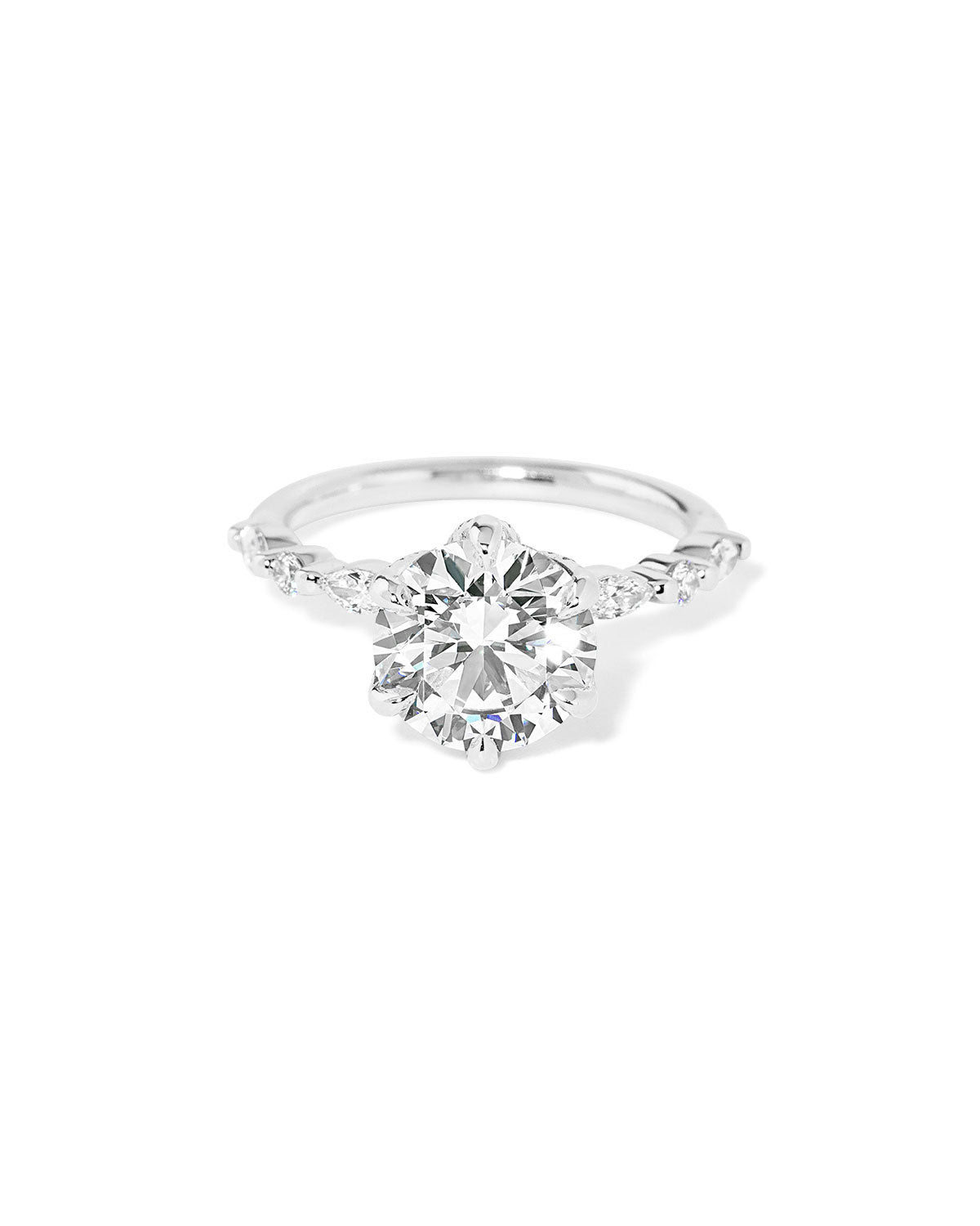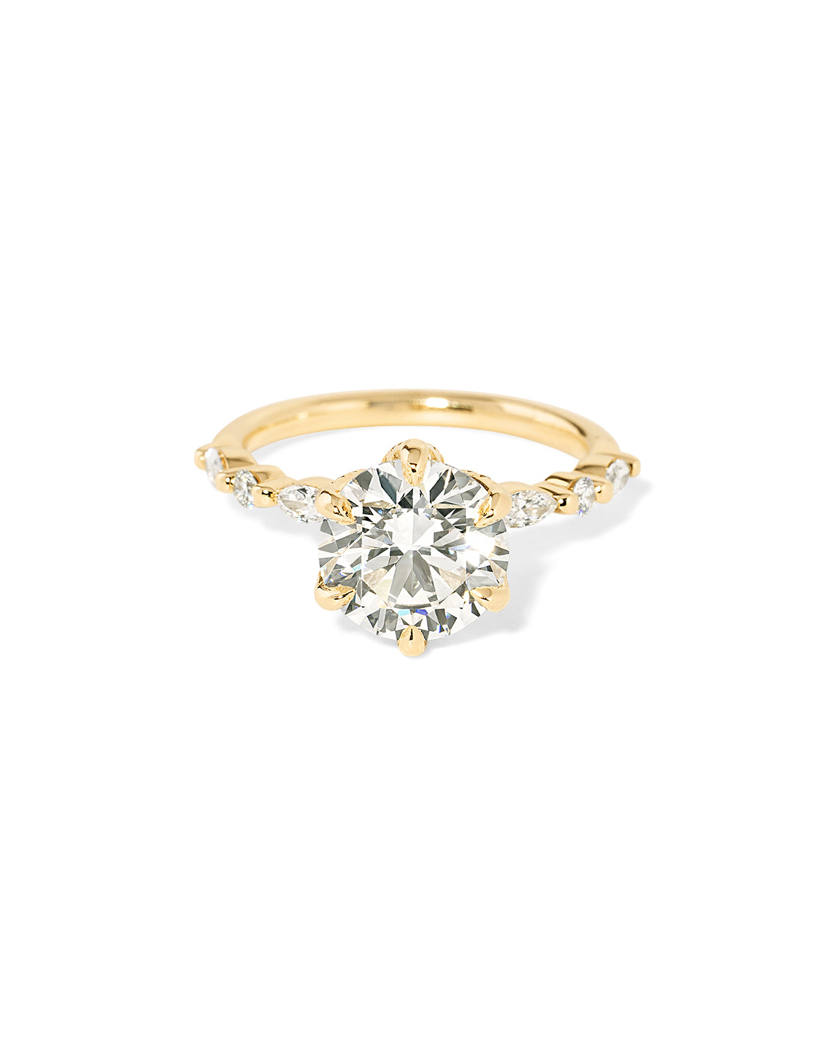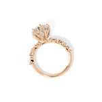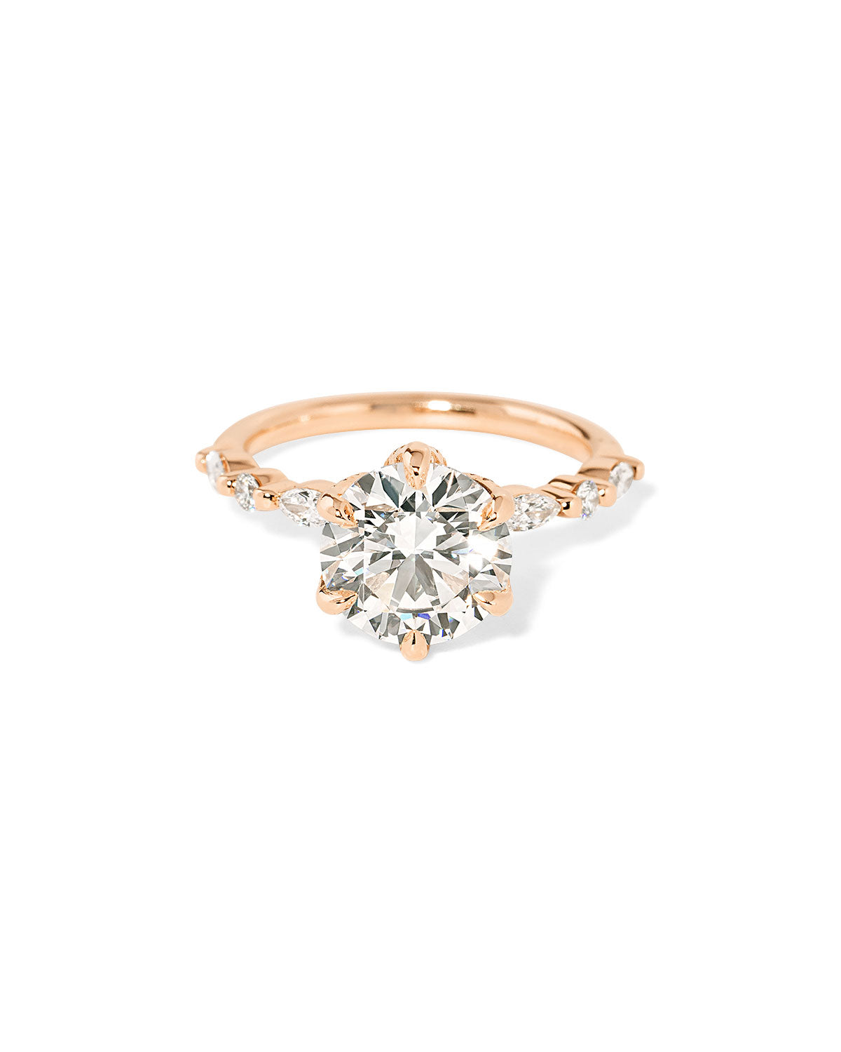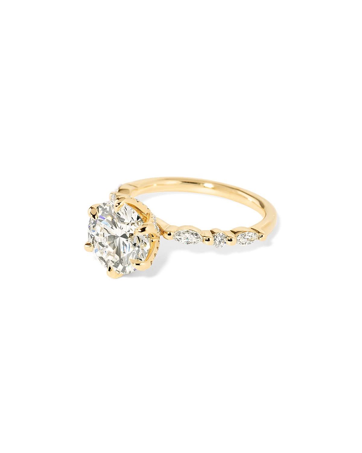 The Ren features a floating diamond band of marquise and round diamonds with pavé diamond lotus petal prongs.