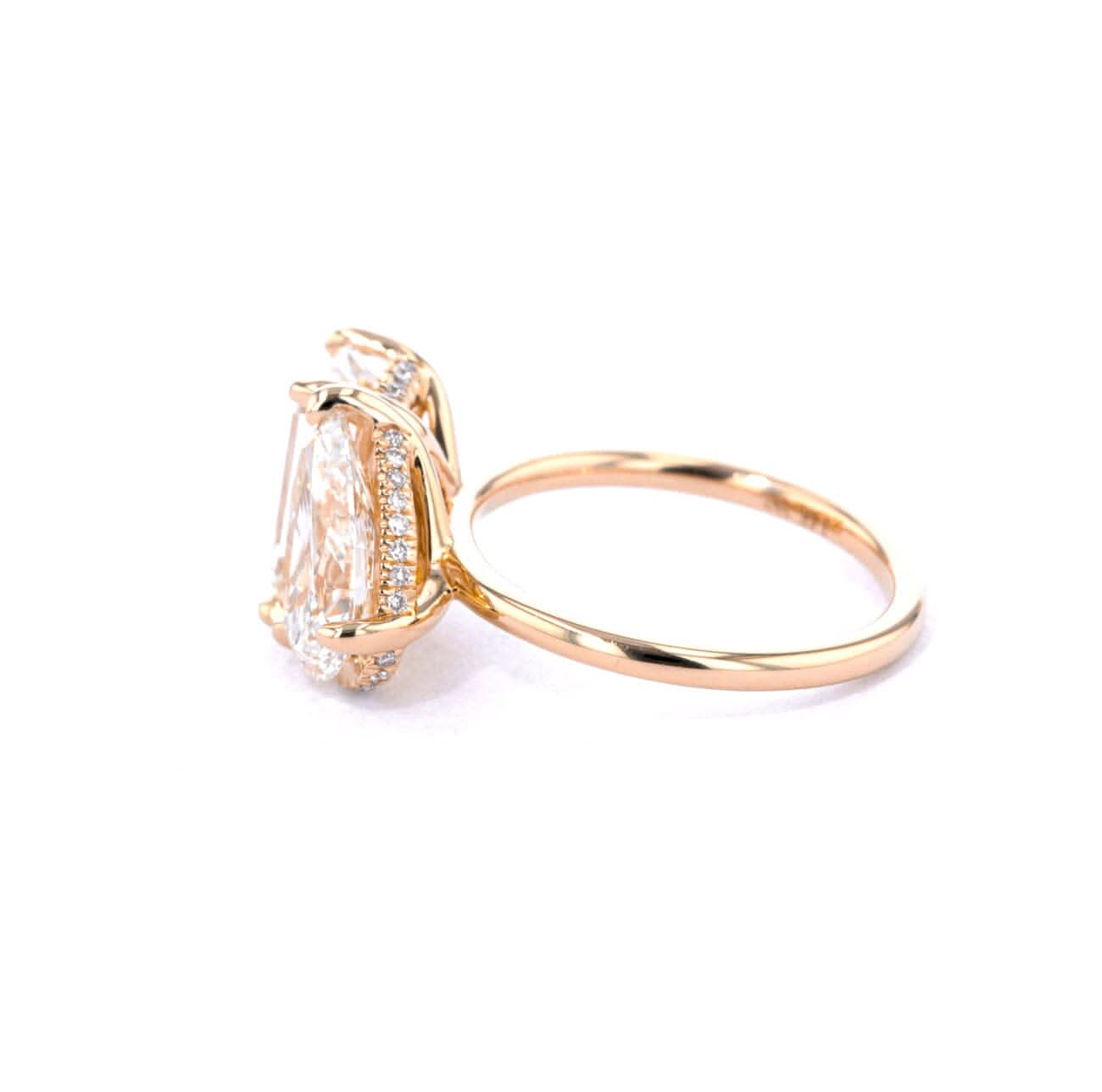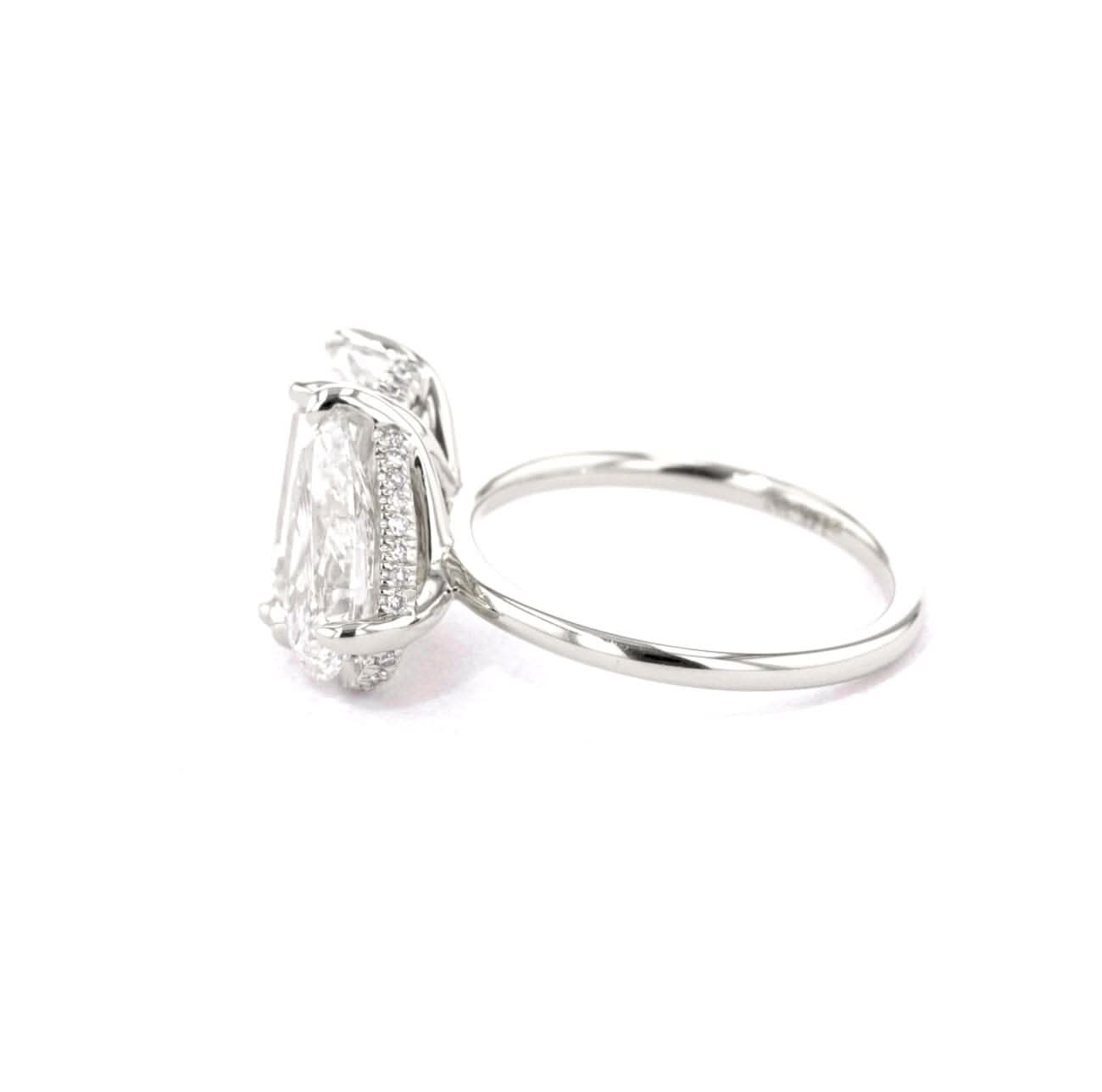 ✦ Hidden Halo: A band with diamonds set into it that goes underneath the center stone and sits between the prongs. This style works best for rounded diamond shapes. It can only be seen from the side, not the top, and is slightly more recessed under the stone.