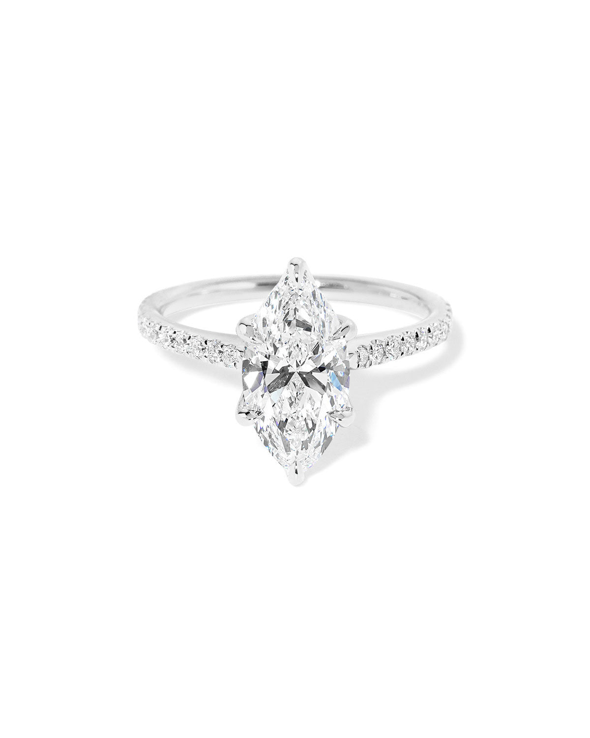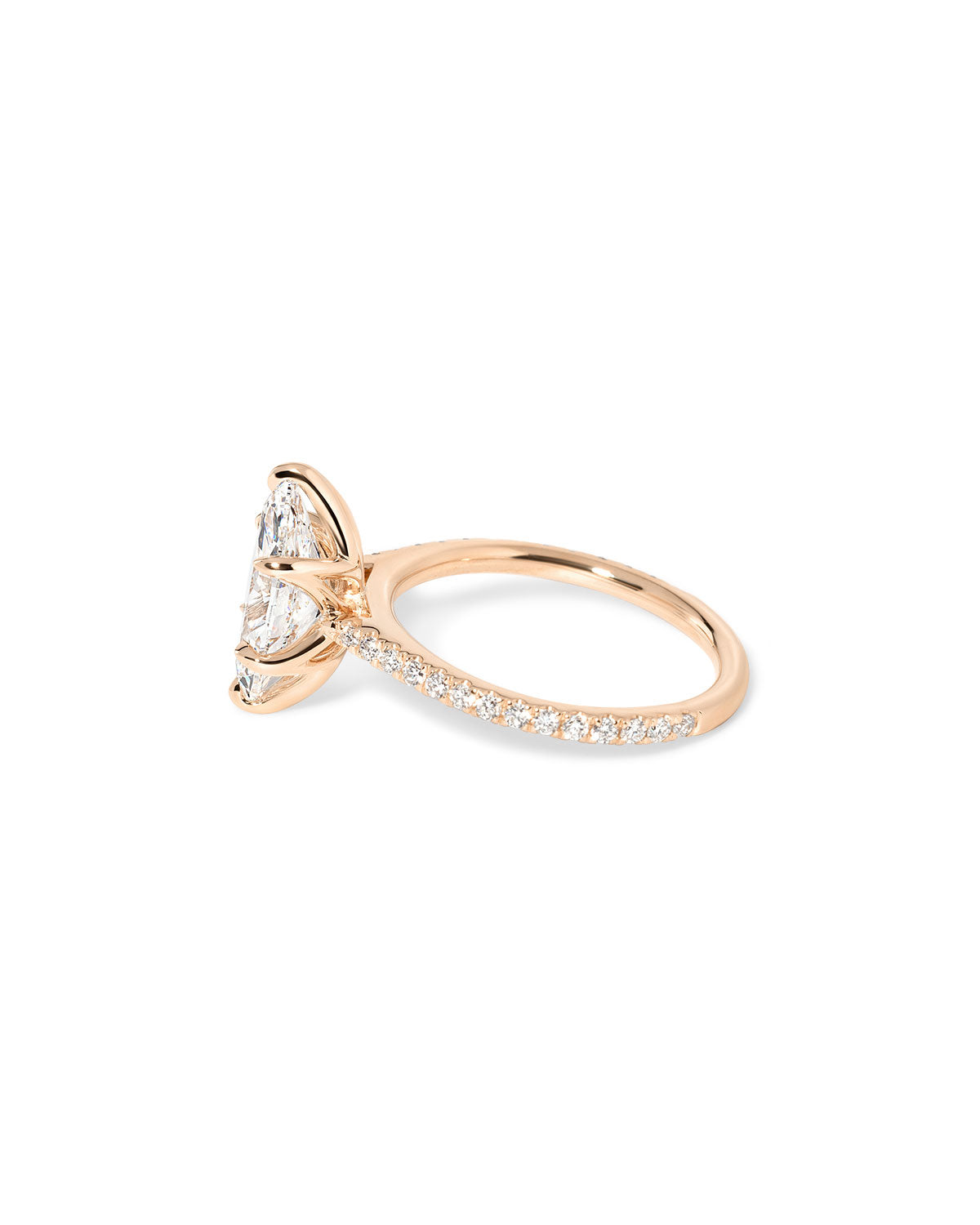 The Victoria features a classic pavé comfort-fit band and a cathedral-style silhouette with sleek, high-polish lotus petal prongs.